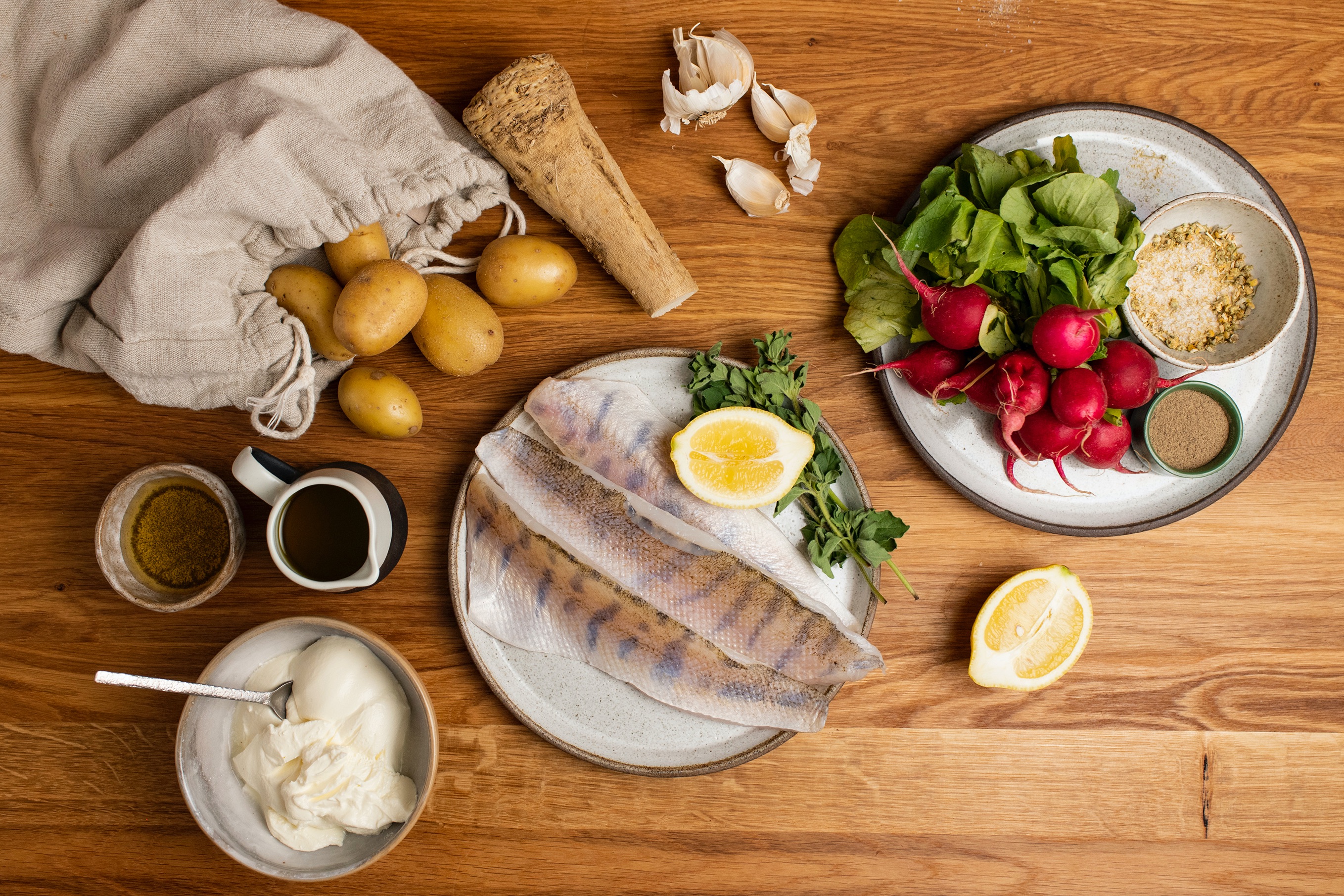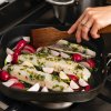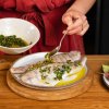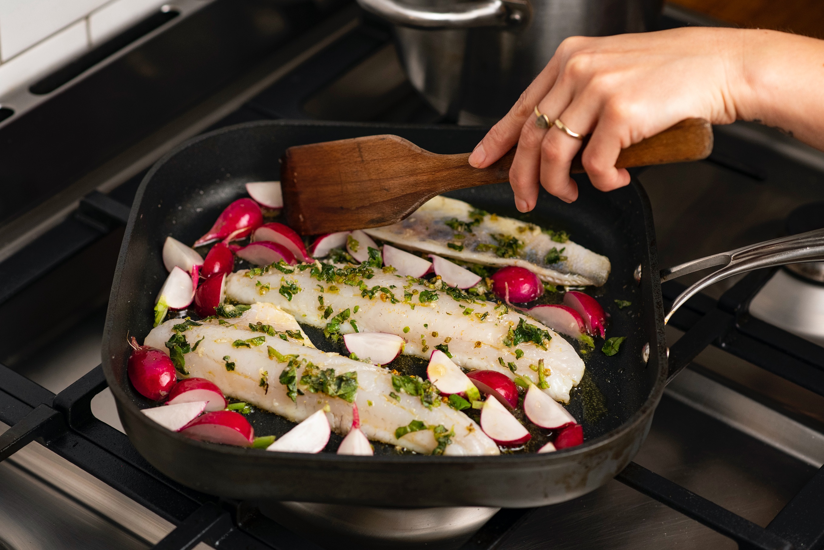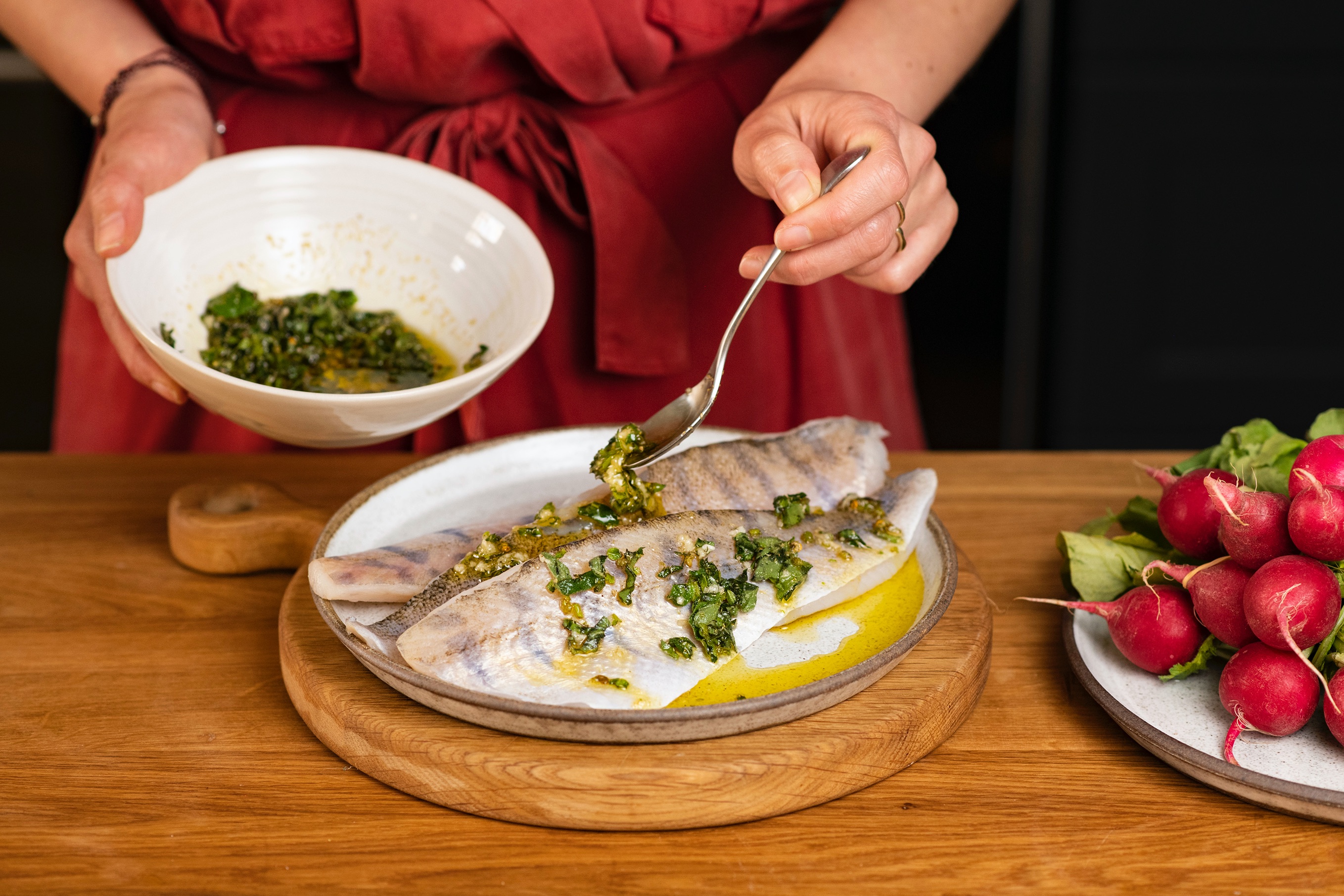 V malé misce smíchejte heřmánkovou sůl s nasekanými listy oregana, špetkou pepře a olivovým olejem. Ochucený olej vmasírujte do ryby. Očistěte ředkvičky a nakrájejte je na čtvrtky. Rozpalte pánev a vložte na ni filety z candáta. Přidejte k nim ředkvičky a pomažte je zbylým olejem. Smažte z každé strany 3–4 minuty.