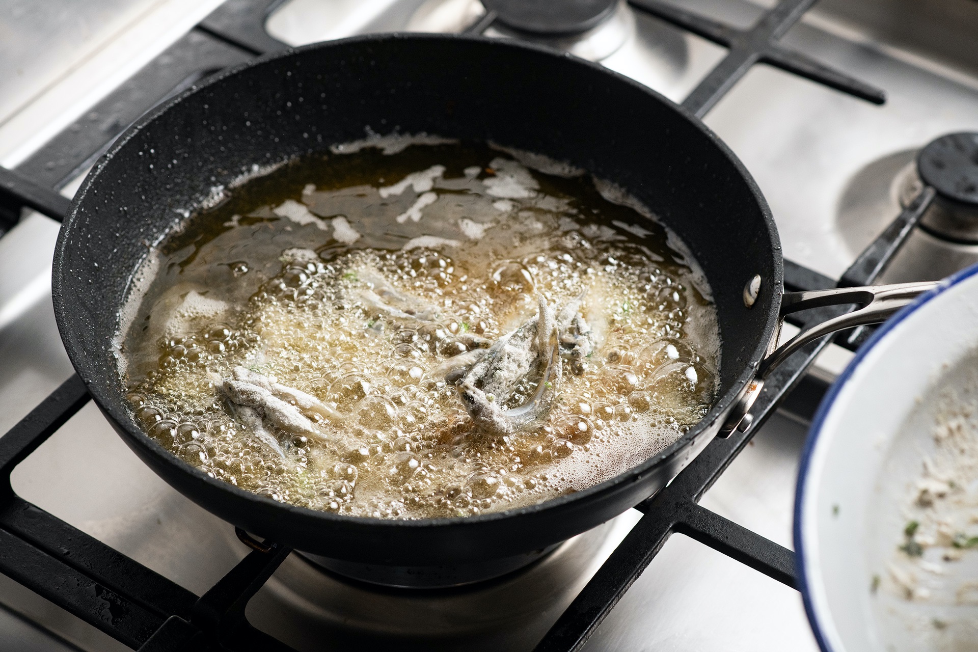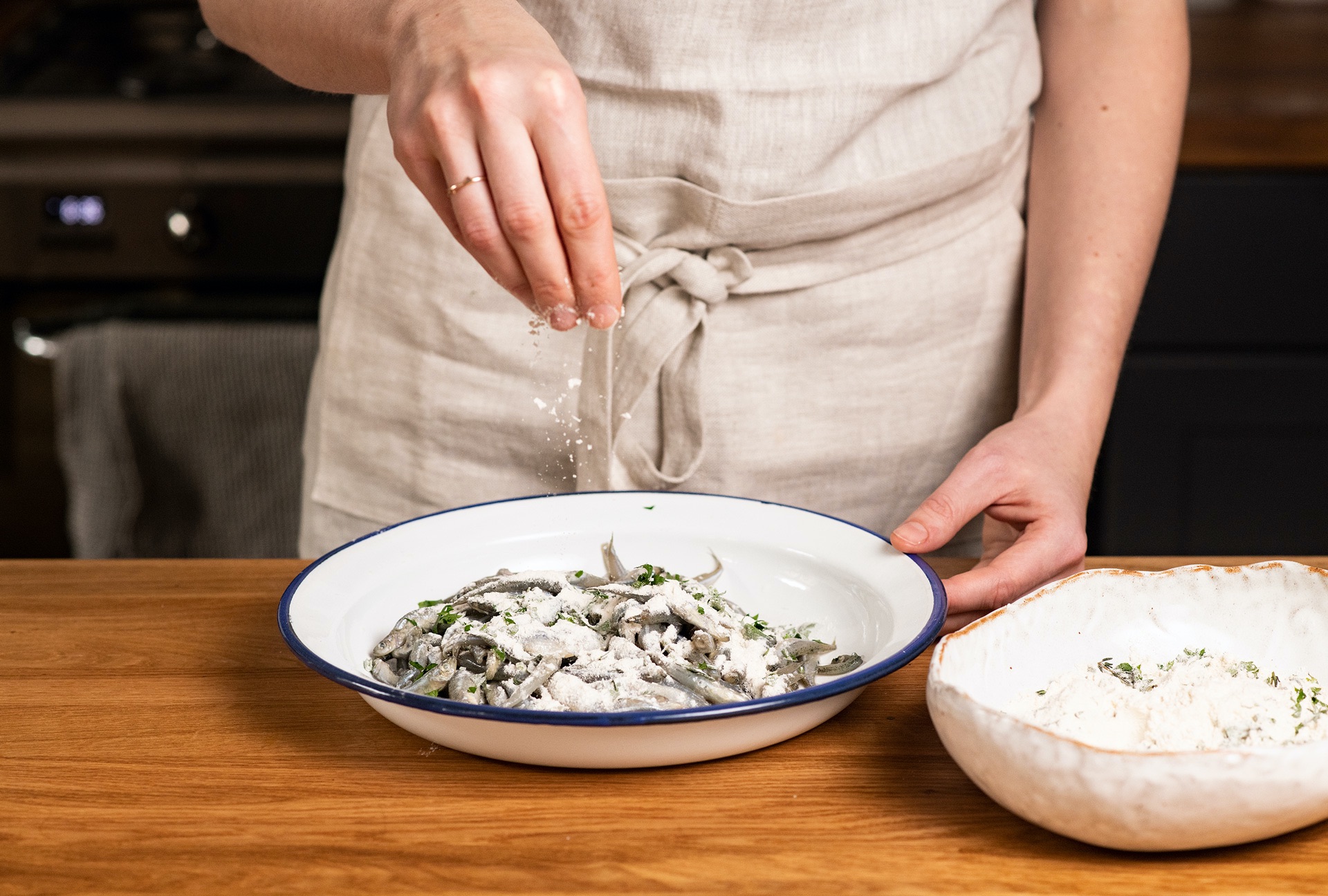 Grundle opláchněte, vysušte, osolte je a opepřete. Hladkou mouku vsypte do mísy. Bylinky nasekejte a přidejte k mouce. Osolte je a opepřete. Grundle zaprašte moukou a jemně promíchejte. Do pánve nalijte olej, zahřejte ho a grundle smažte na pánvi dokřupava.