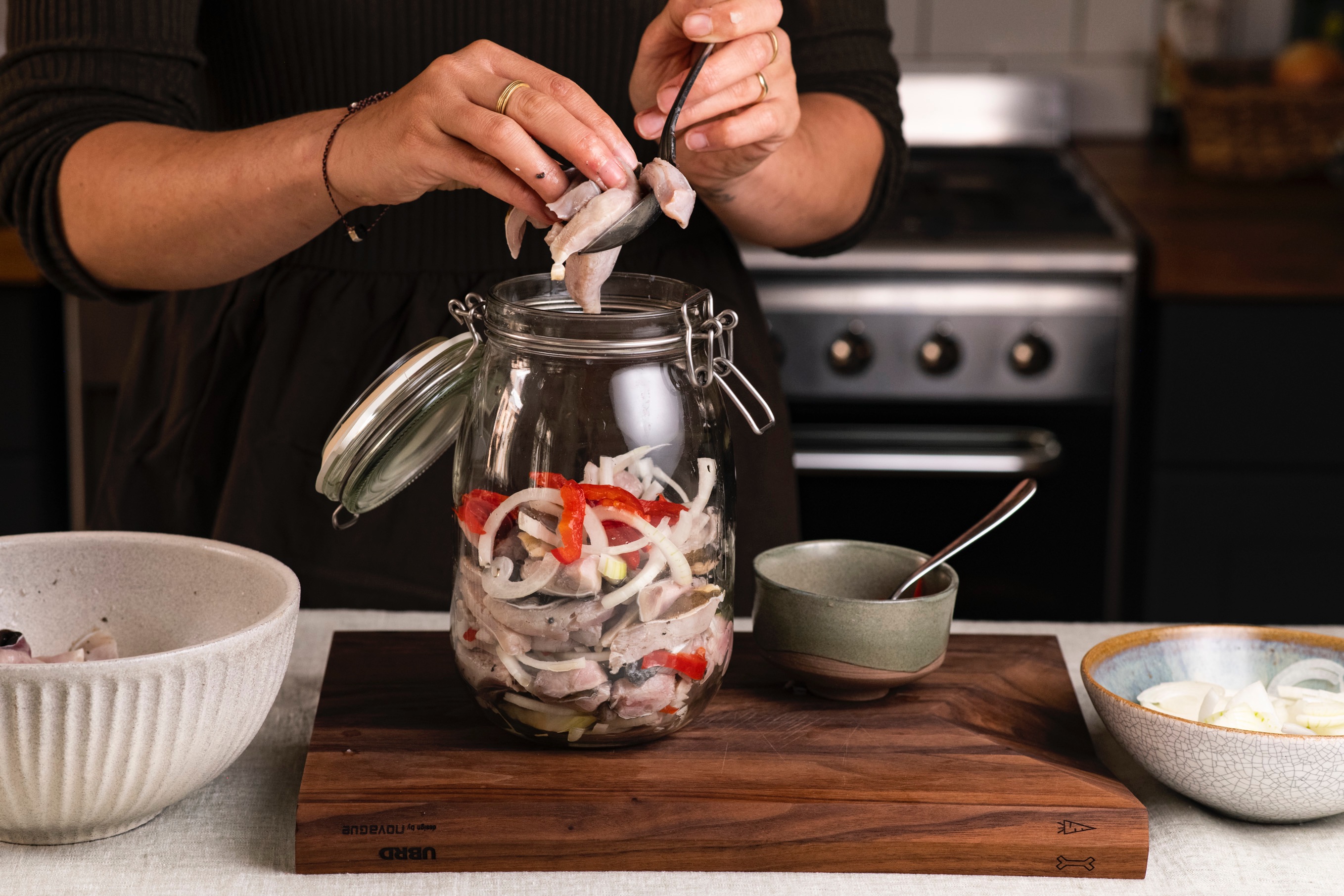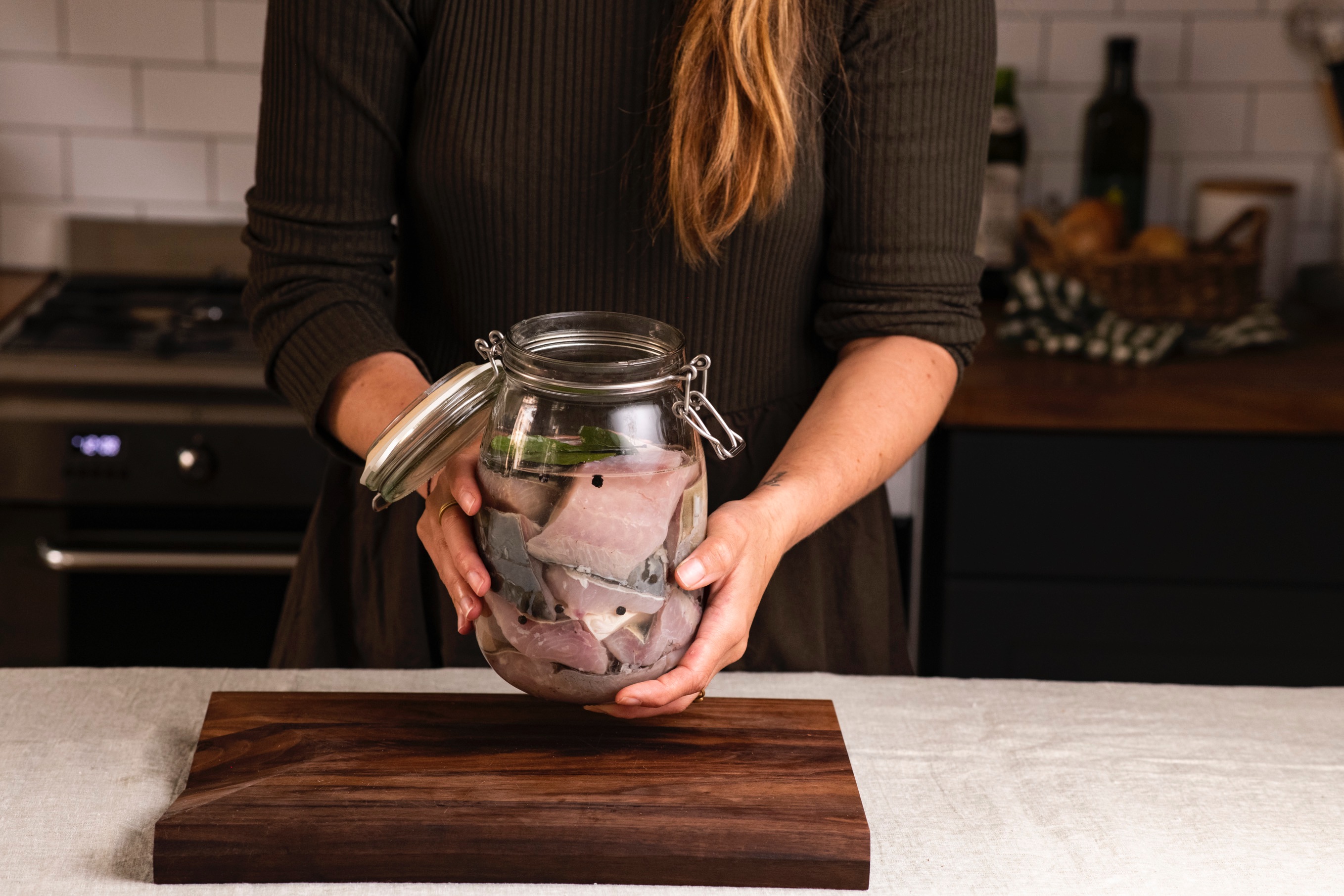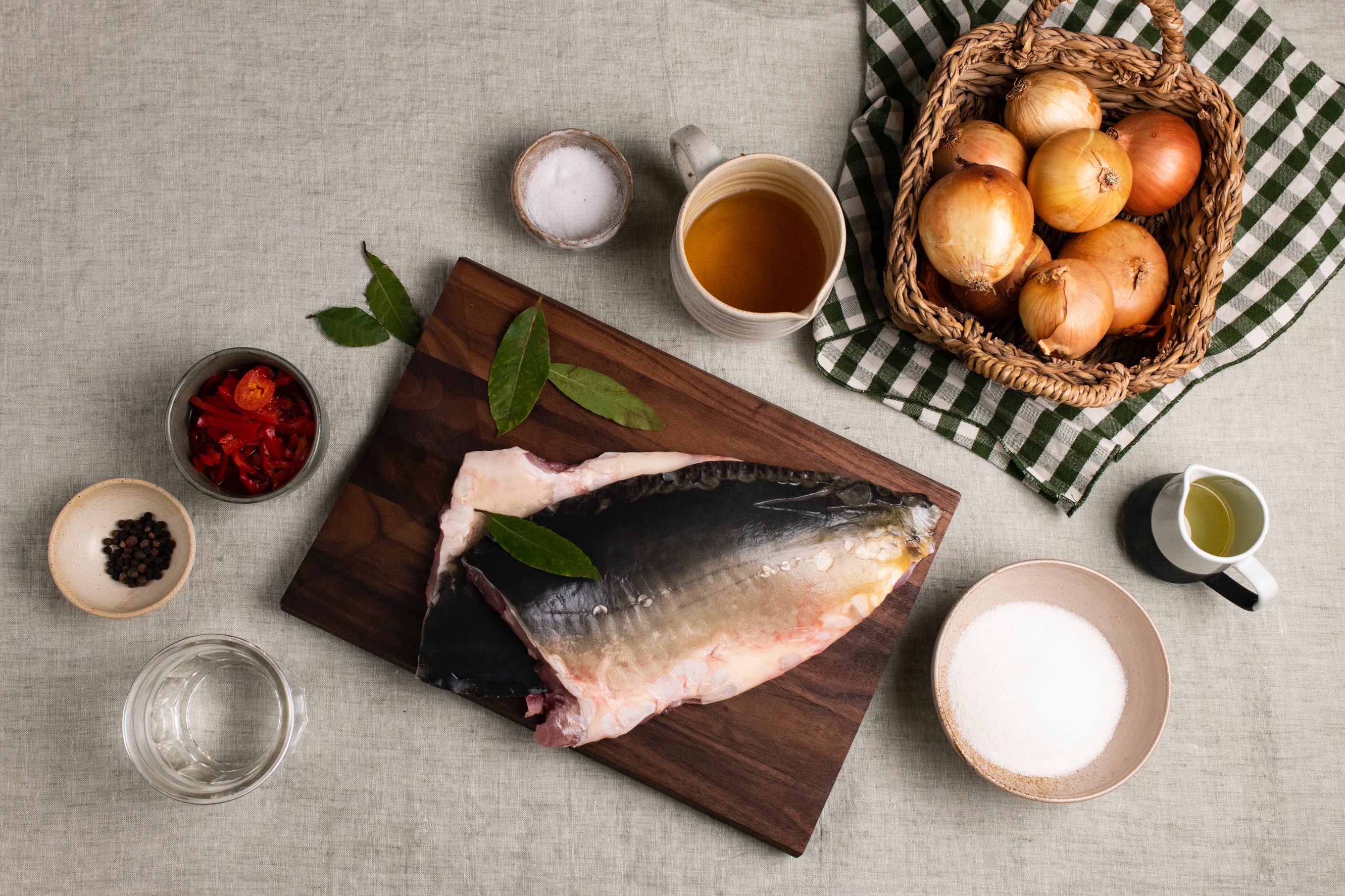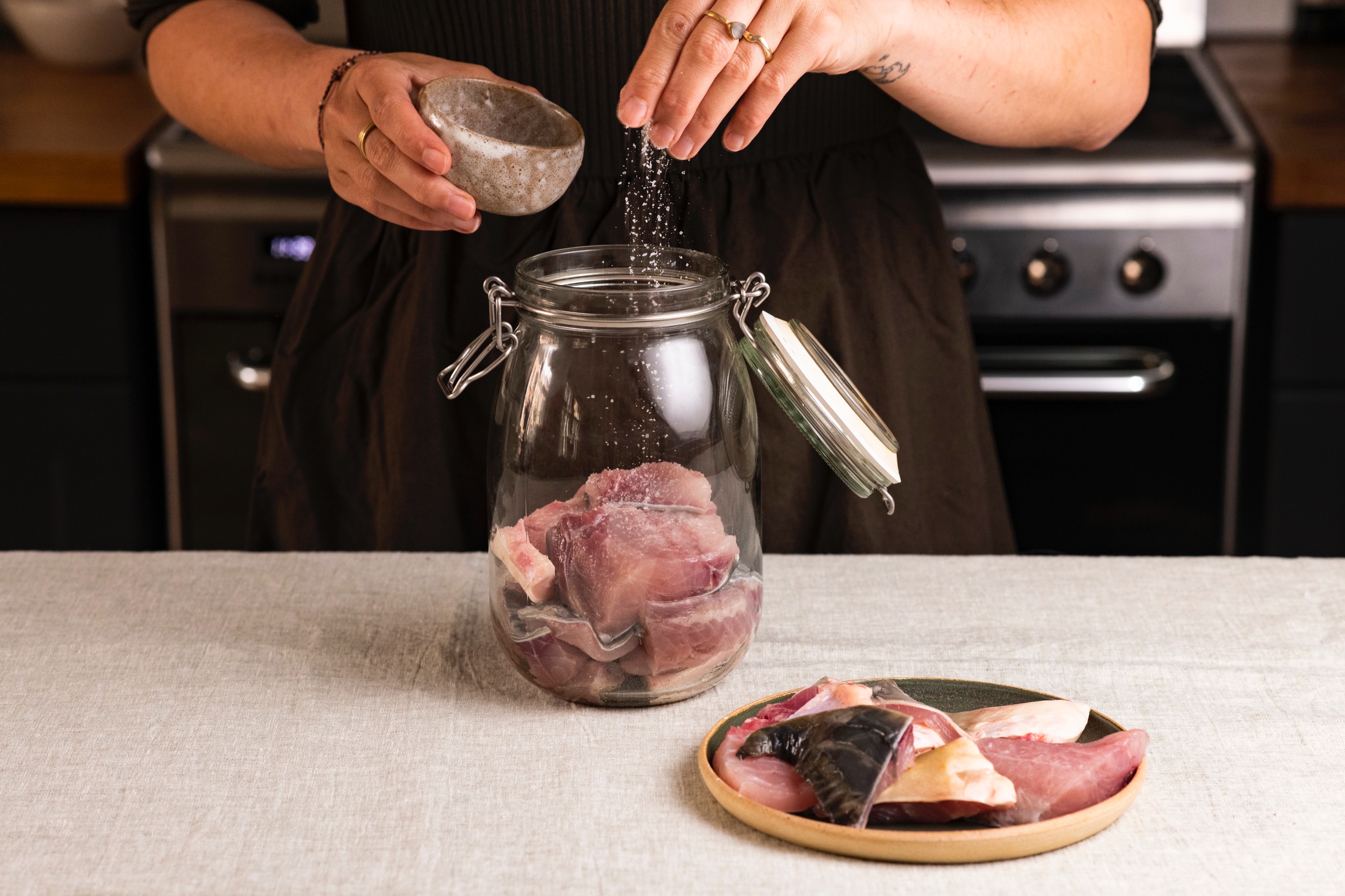 Kapra očistěte a zbavte pouze velkých dlouhých kostí. Nakrájejte filety na 3–4cm kostky, každý kus důkladně osolte a nechte odležet přes noc v lednici v uzavíratelné sklenici. Na 1 kg rybího masa je třeba asi 2 lžíce soli. Maso se díky ní zpevní.