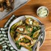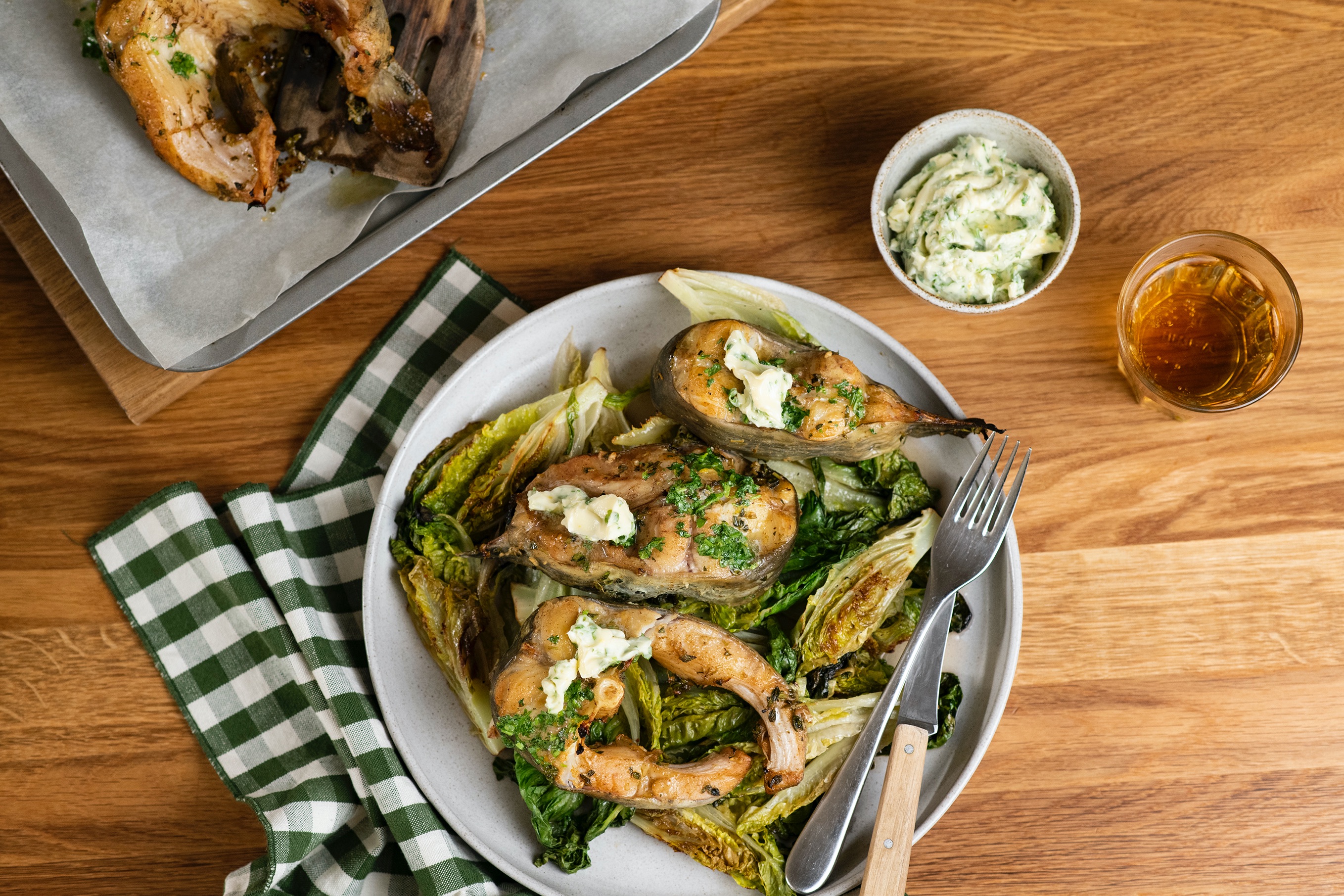 Hotovou rybu ozdobte bylinkovým máslem a podávejte s orestovaným salátem.