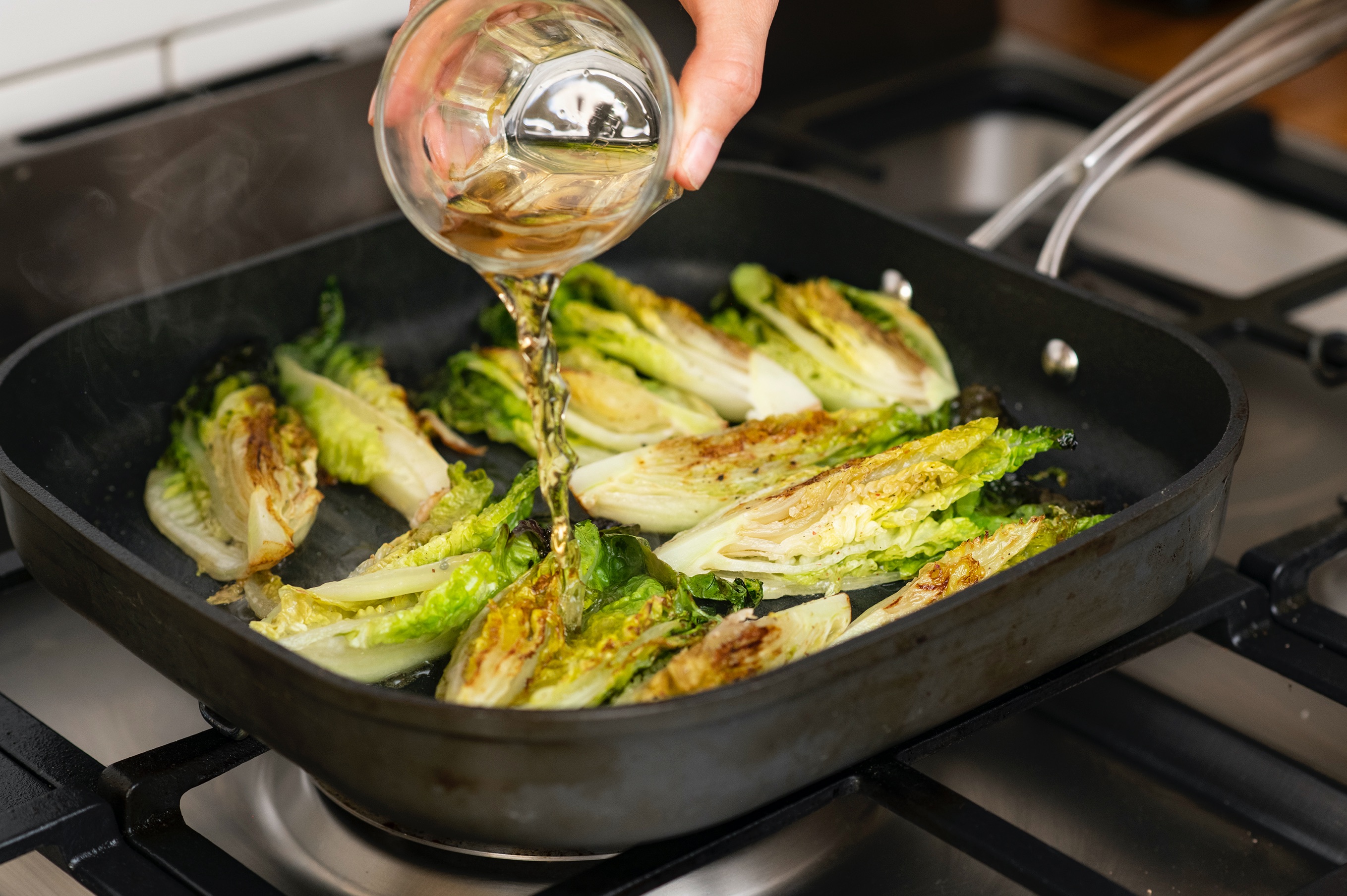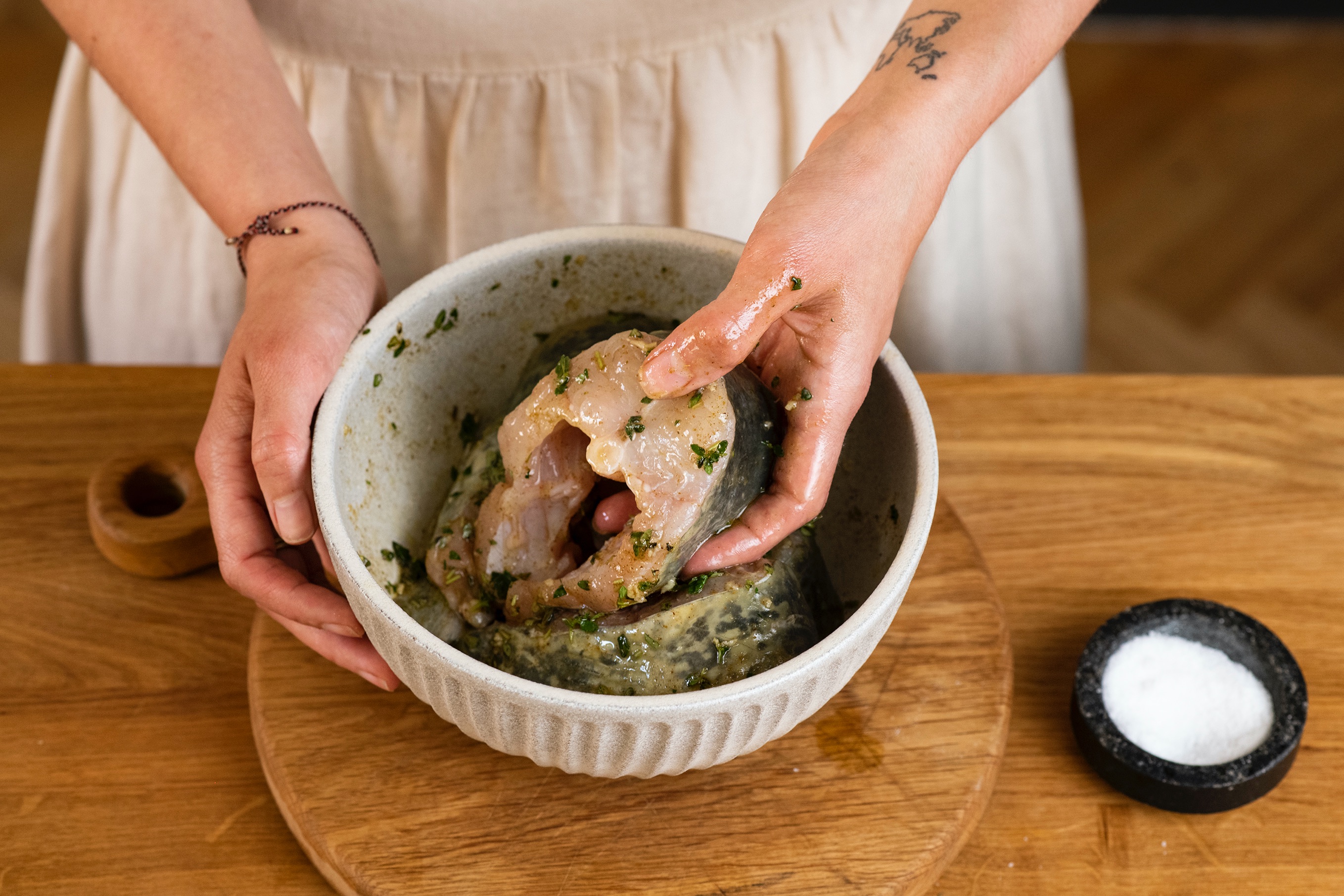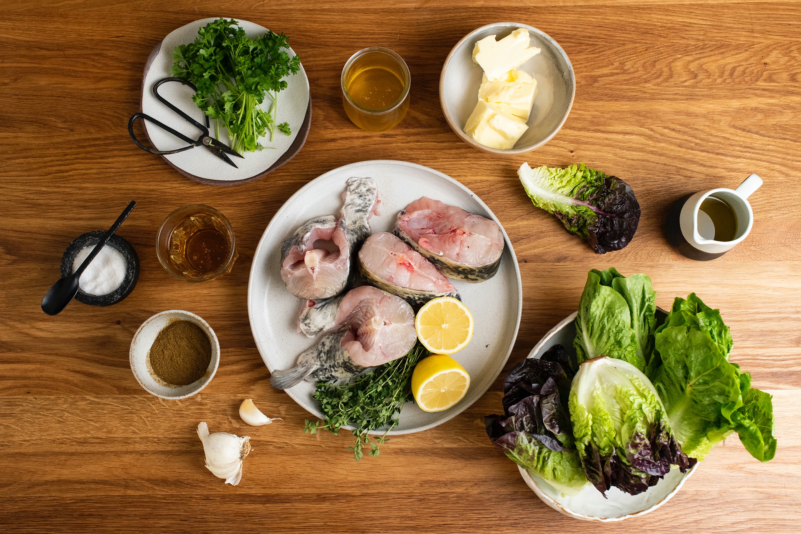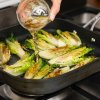 Než dáte rybu péct připravte bylinkové máslo. Petrželku nasekejte najemno, přimíchejte ji k máslu a dochuťte citronovou kůrou a solí. Očistěte hlavičky salátu a následně je rozčtvrťte. Na větší pánvi rozpalte olivový olej, přidejte salát a restujte ho z každé strany asi 3 minuty. Na závěr salát na pánvi zalijte ciderem a nechte jej odpařit. Osolte a opepřete.