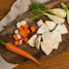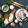 Ve větším hrnci rozehřejte lžíci oleje. Kořenovou zeleninu oškrábejte a nakrájejte na menší kousky. Fenykl očistěte a nakrájejte na čtvrtky. Cibuli rozpulte a spolu s ostatní zeleninou dejte do hrnce. Restujte, dokud nebude zelenina lehce dozlatova. Zalijte bílým vínem a nechte odpařit všechen alkohol. Zalijte studenou vodou. Přidejte odřezky z ryb, bylinky, koření. Přiveďte k varu, stáhněte z plamene a nechte lehce probublávat. Táhněte 30 minut. Vývar sundejte z plamene a nechte 10 minut odležet. Díky krátkému odležení sedne obsah hrnce na dno a vy poté můžete polévku scedit. Získáte tak krásný, čirý vývar. Z rybích odřezků oberte vařené maso.