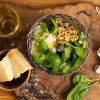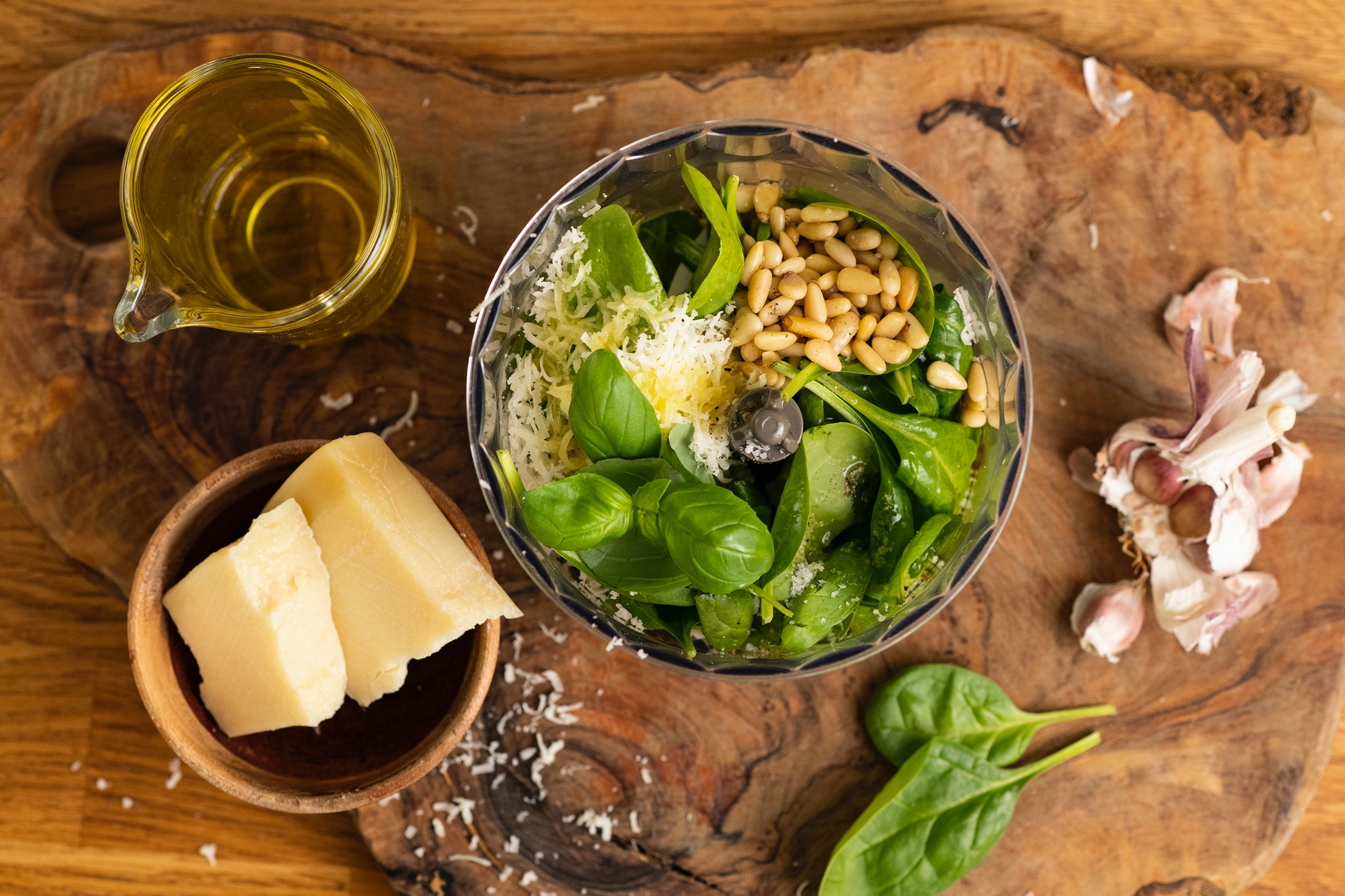 Ingredience na pesto dejte do mixéru a rozmixujte dohladka. Dochuťte solí a pepřem.