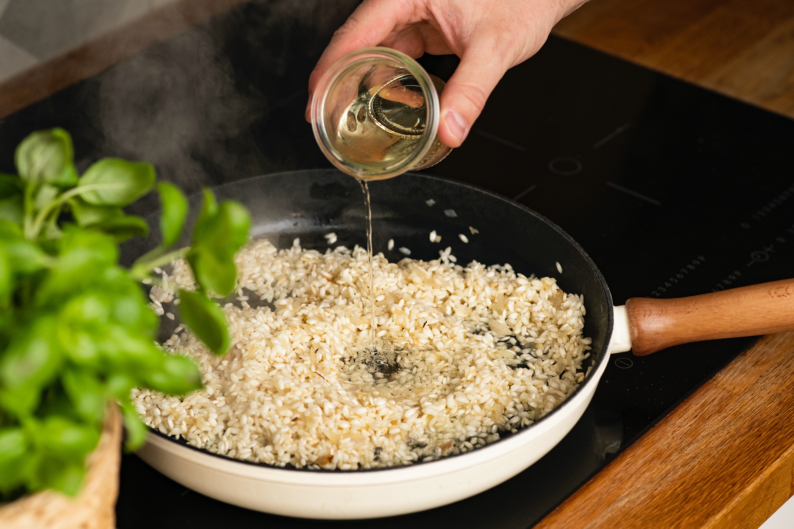 Ve větší pánvi rozehřejte olivový olej. Šalotku nakrájejte nadrobno a restujte, než zesklovatí. Přidejte rýži a restujte 3 minuty. Zalijte bílým vínem a nechte odpařit všechen alkohol. Za stálého míchání přilévejte vývar, dokud nebude rýže na skus.