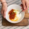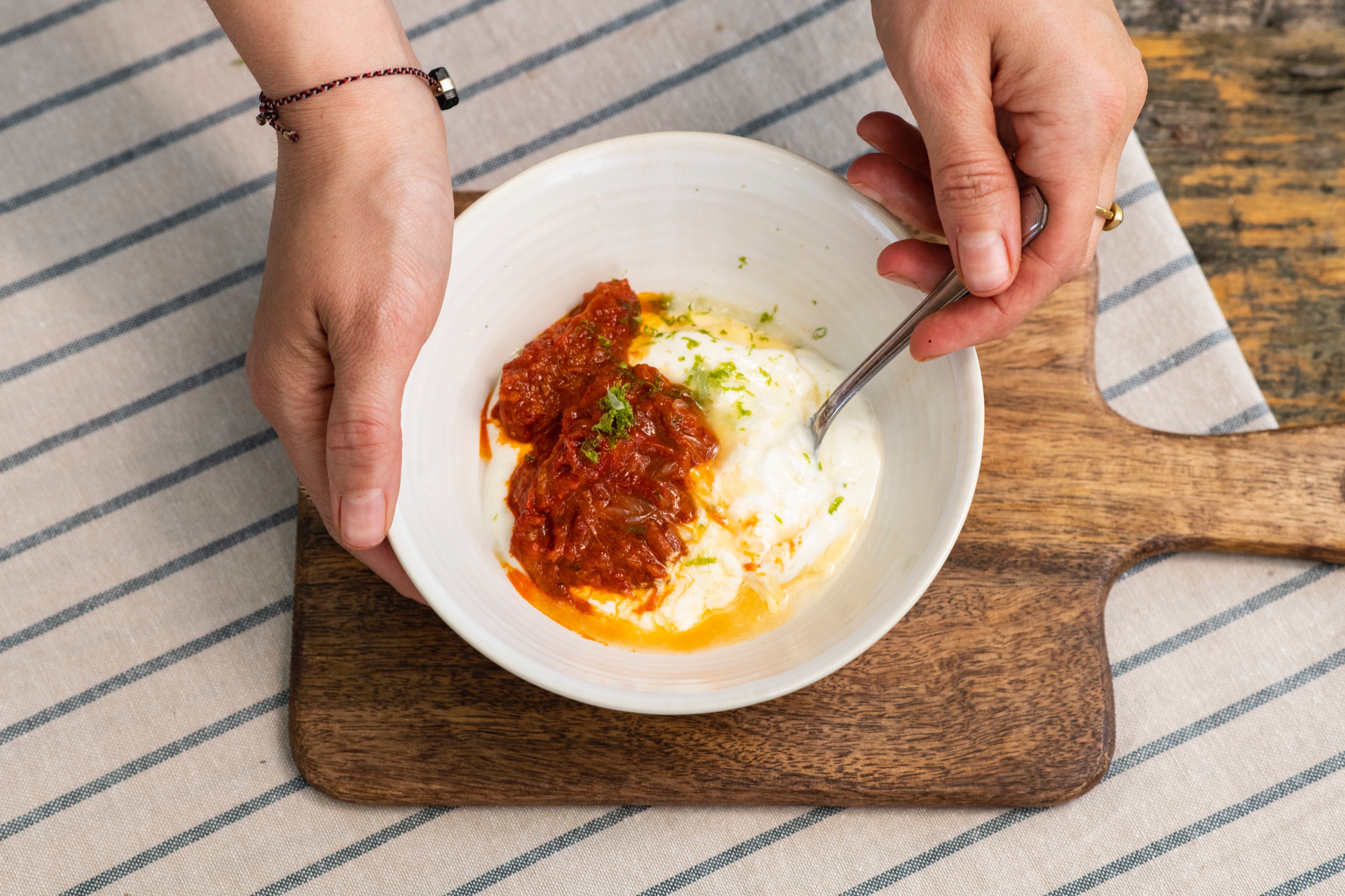 V malé mističce smíchejte majonézu, zakysanou smetanu a ajvar, osolte a opepřete.