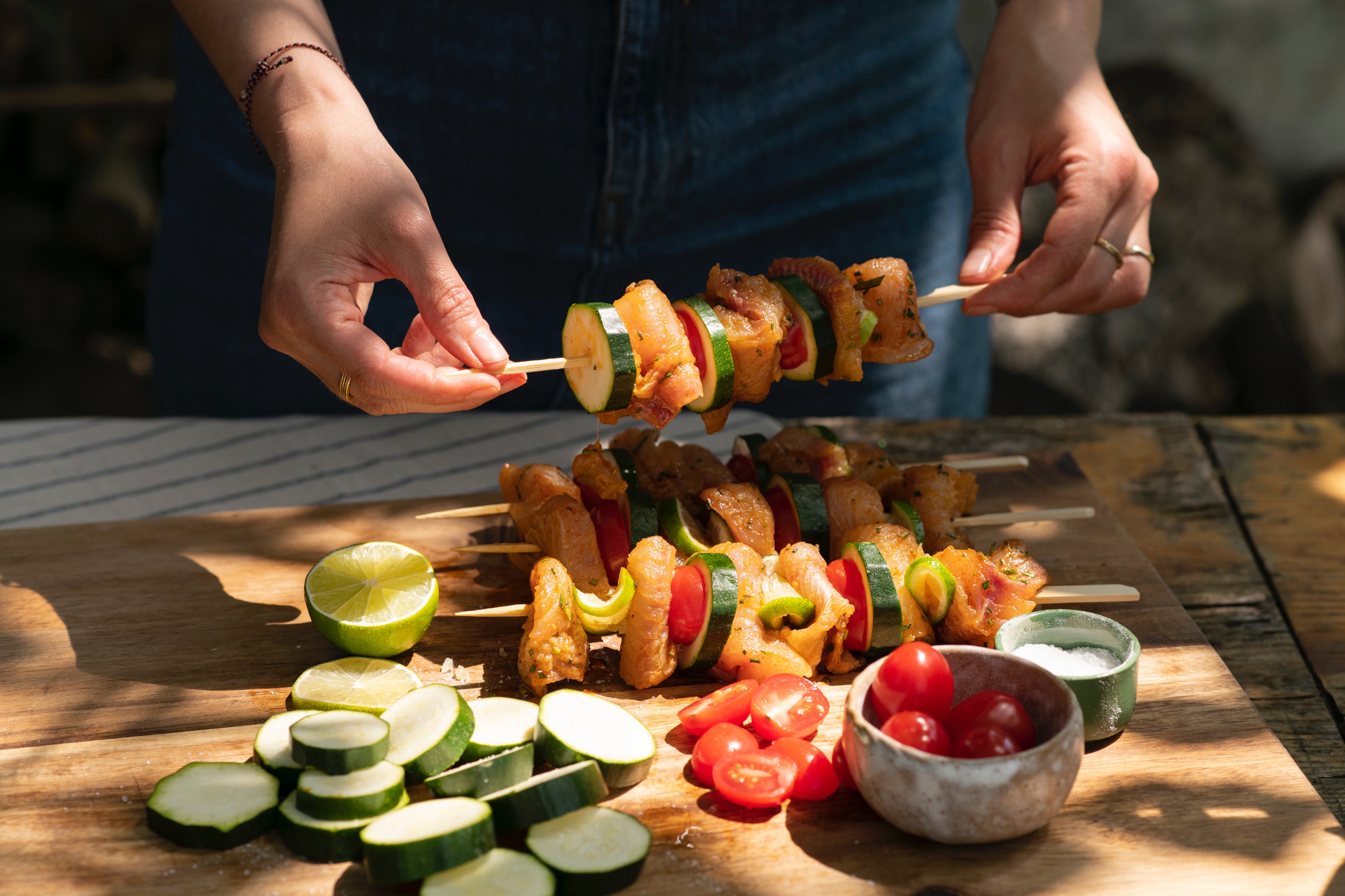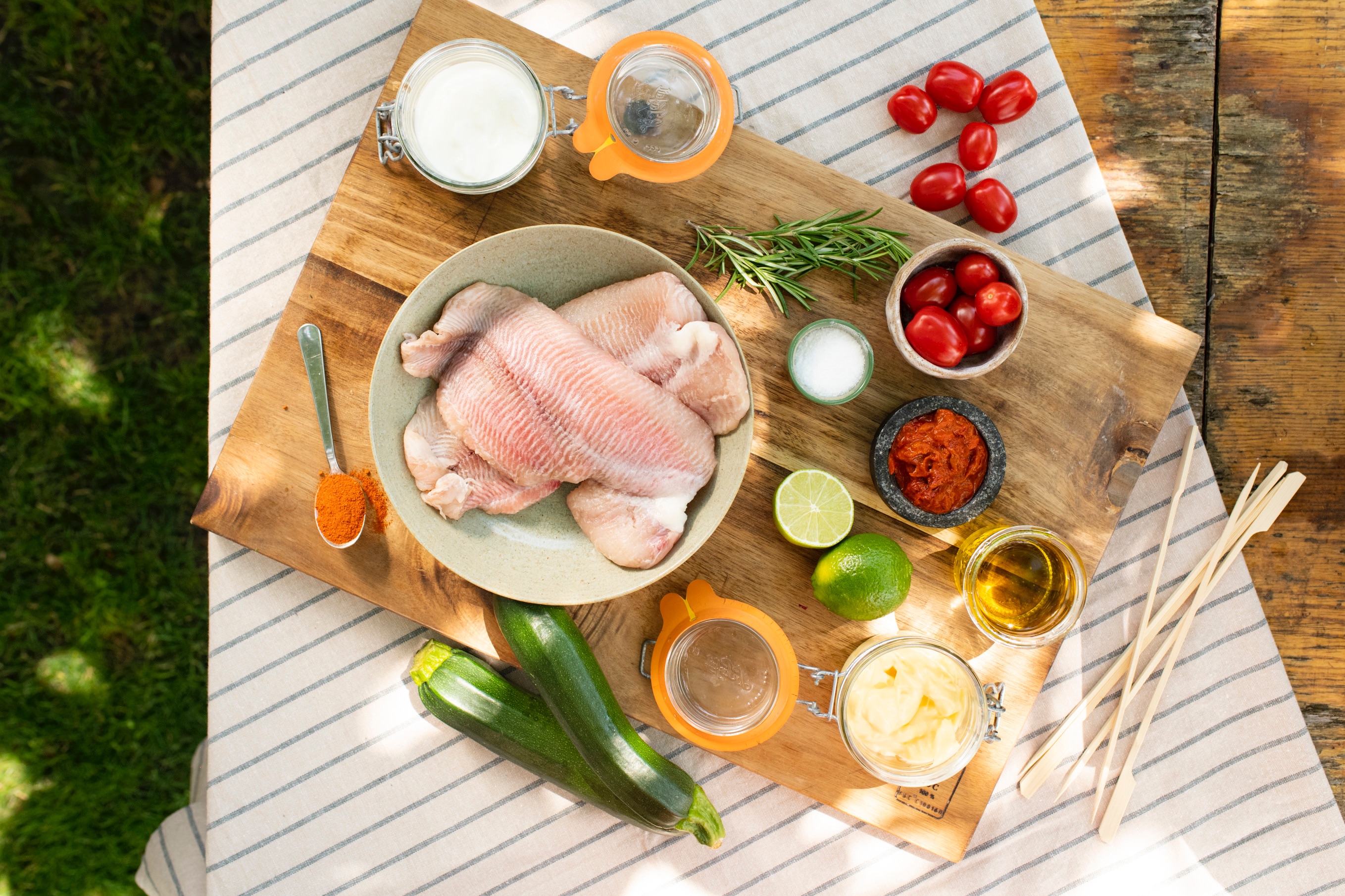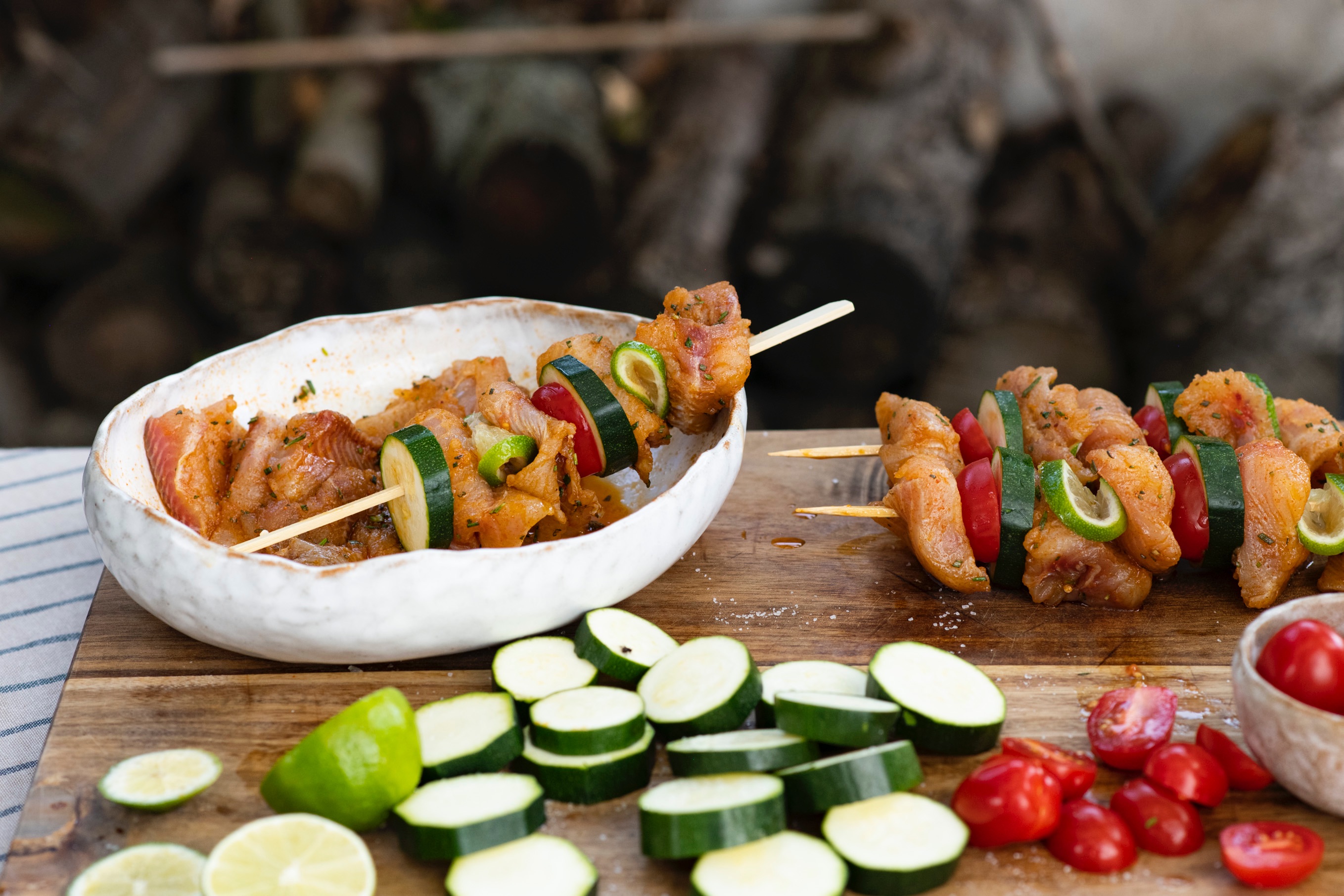 Nakrájejte cuketu na širší kolečka, limetu na úzké plátky a cherry rajčata překrojte napůl. Špejle na špíz namočte a začněte napichovat rybí maso, limety, poté opět maso a následně zeleninu. Z každé strany grilujte asi 6 minut.