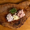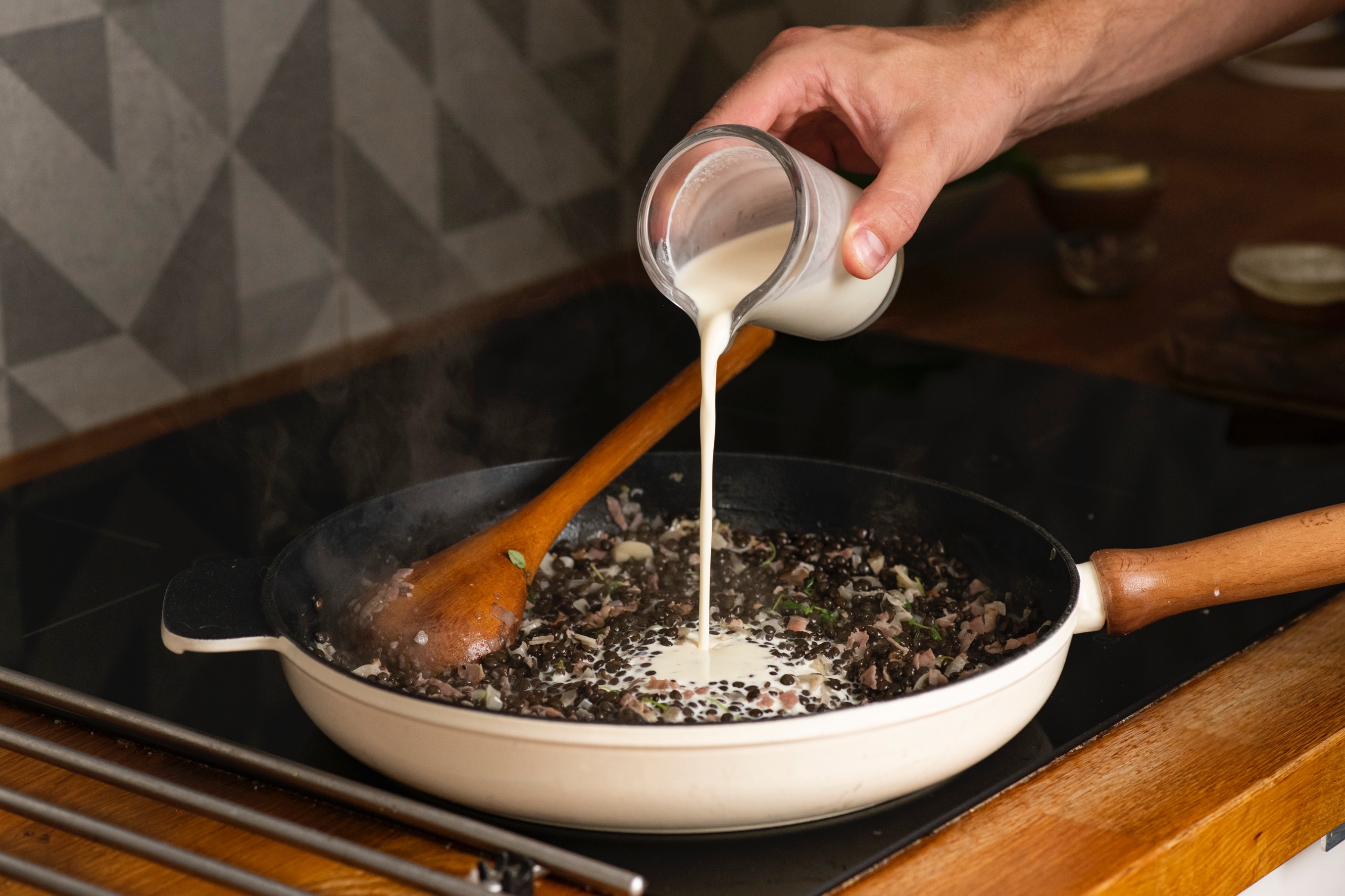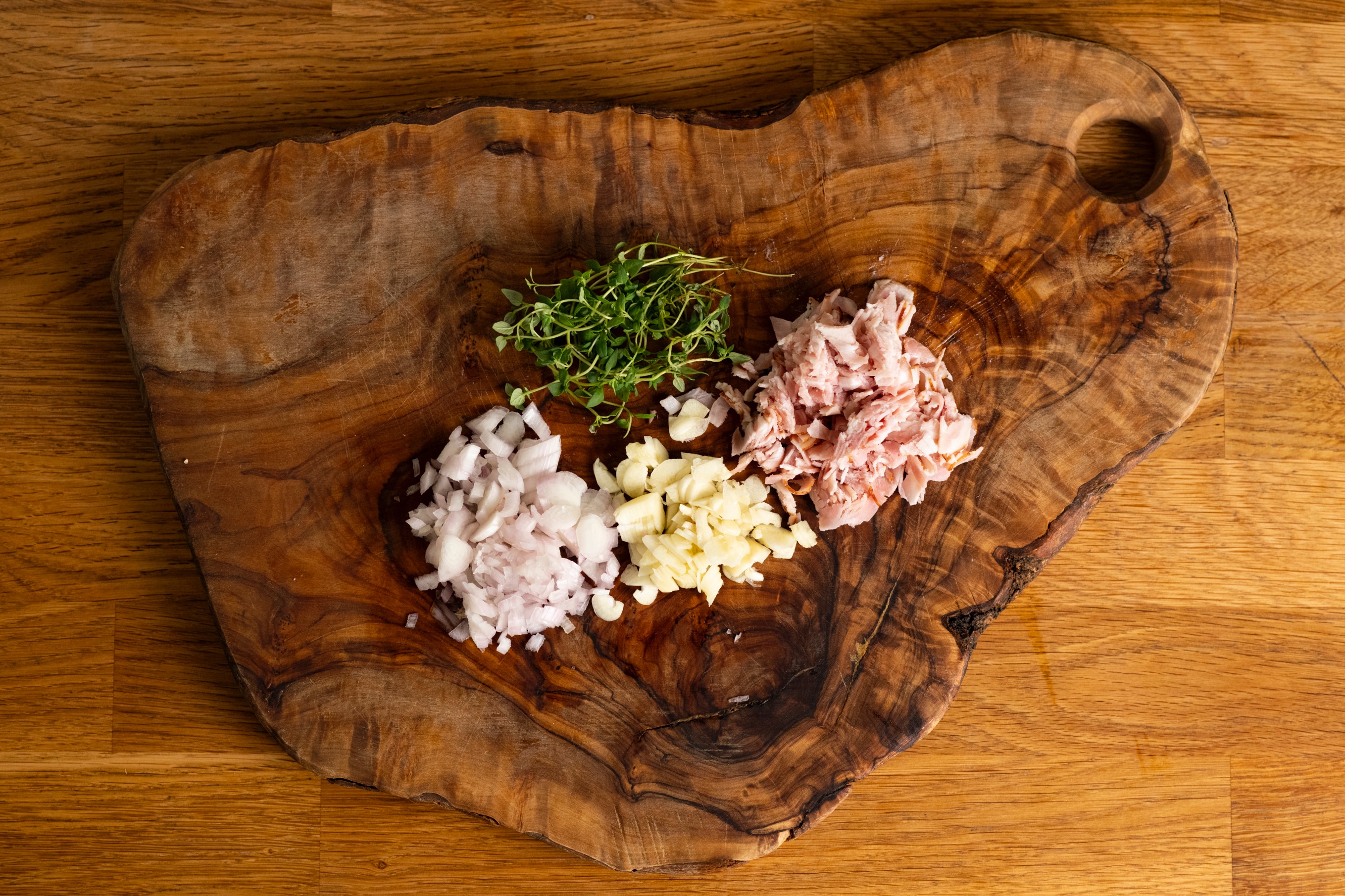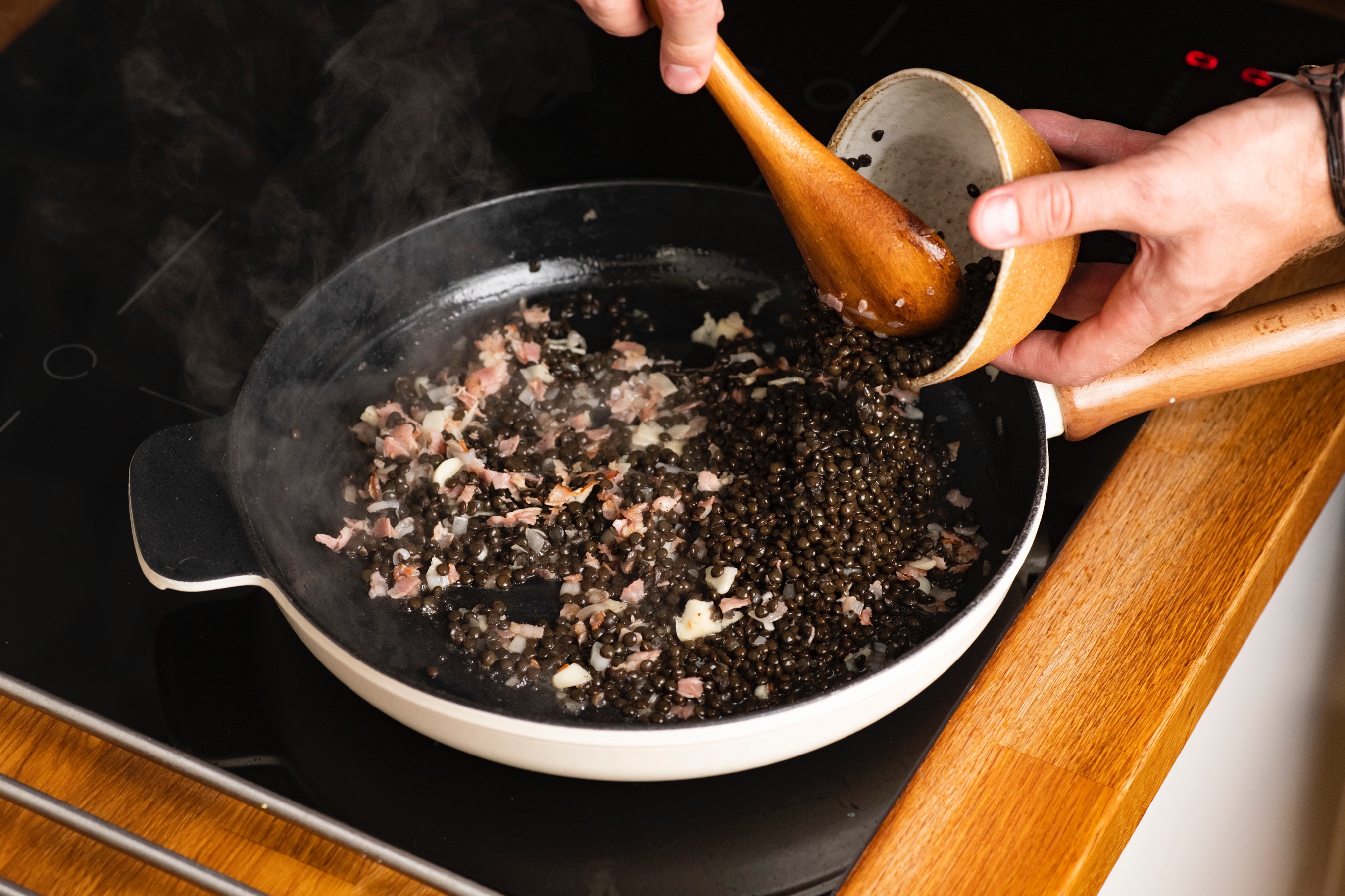 Slaninu nakrájejte na kostičky a přidejte na pánev lehce orestovat. Poté přidejte šalotku a až jako poslední na chvíli česnek. Přisypte vařenou čočku, osolte, opepřete a dobře promíchejte. Zalijte smetanou, přidejte čerstvý tymián, listový špenát a stáhněte z plamene. Přidejte 50 g másla a promíchejte. Díky máslu dosáhnete krémové konzistence.