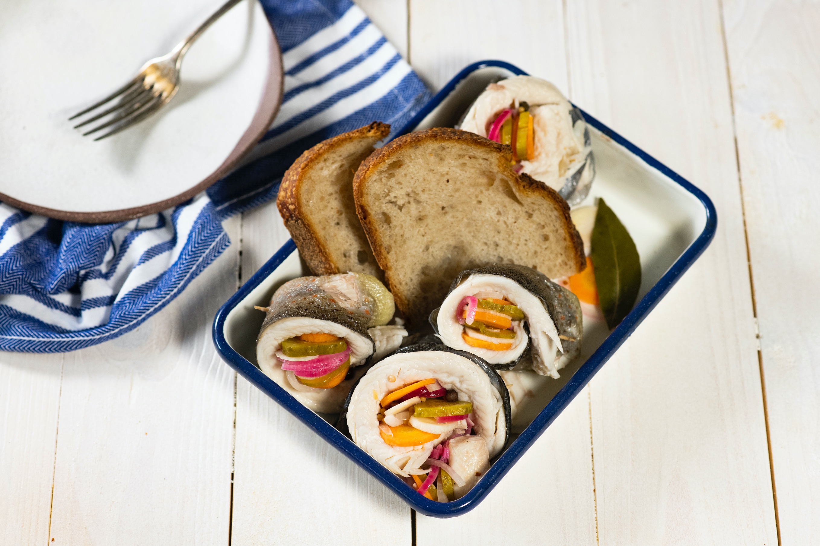 Filety ze pstruha zbavte pomocí pinzety případných kostí. Cibuli oloupejte a nakrájejte na plátky. Mrkev a petržel očistěte a společně s nakládanými okurkami nakrájejte na kolečka. Filety ze pstruha rozložte na prkénko kůží dolů, osolte, opepřete a naplňte nakrájenou zeleninou. Zabalte je a propíchněte špejlí, aby se nerozmotaly.