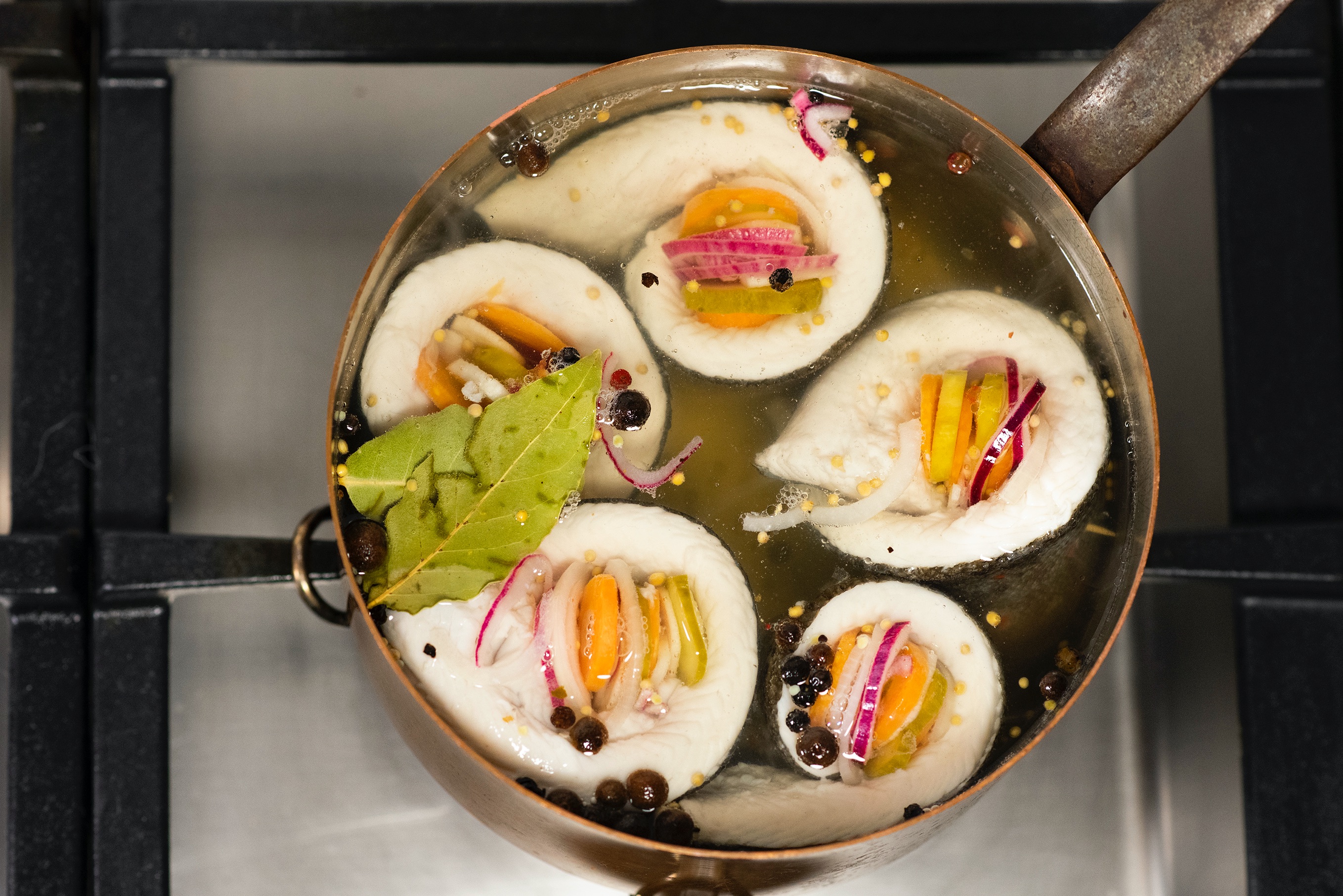 Ingredience na lák dejte do rendlíku a přiveďte k varu. Poté lák stáhněte z plamene a vložte do něj na 3 minuty zavináče.